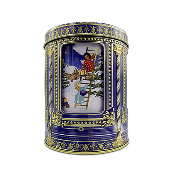 Plåtburk Speldosa Ängel. Plåtburk som ser ut som en karusell med speldosa. Spelar melodin ”Hark the Herald Angels Sing” av Felix Mendelssohn. Skruva upp speldosan under burken så snurrar bakgrundsbilden med motivet av änglar och tomtenissar runt. Perfekt till julgodiset! Rymmer 750 ml.