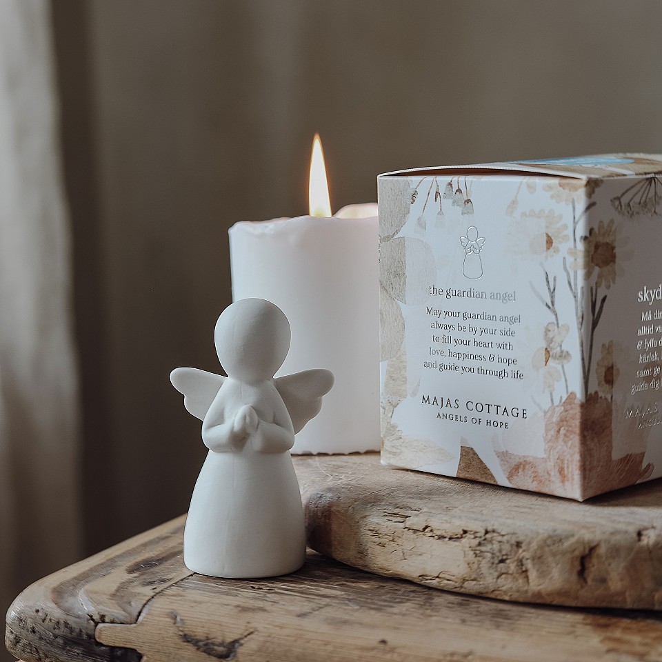 Majas Skyddsängeln i gåvobox. Ängel i vit keramik som håller ihop sina händer. En fin present! Kommer i en gåvobox med fin text: