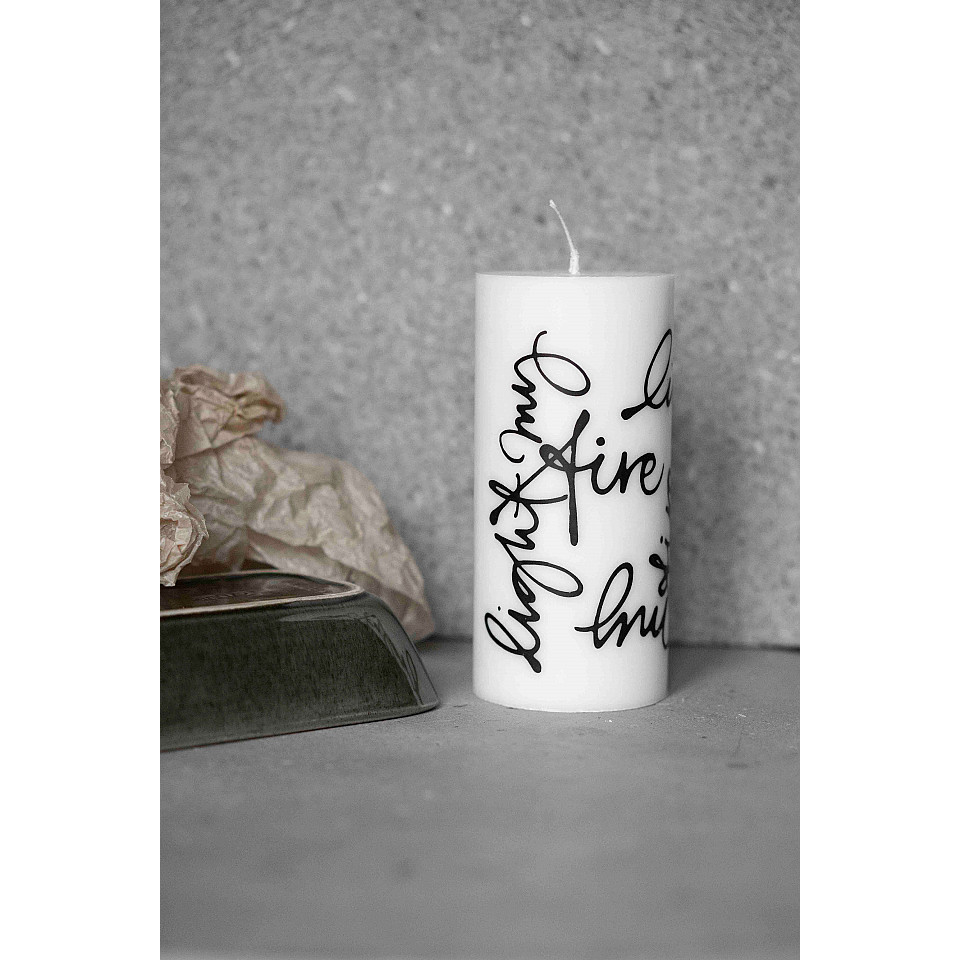 Ylva Skarp Blockljus Light my fire. Fint blockljus i SVANEN-märkt 100% stearin. Ljuset är genomfärgat i vit färg och och har vacker svart text "light my fire". Brinntid ~50 h.