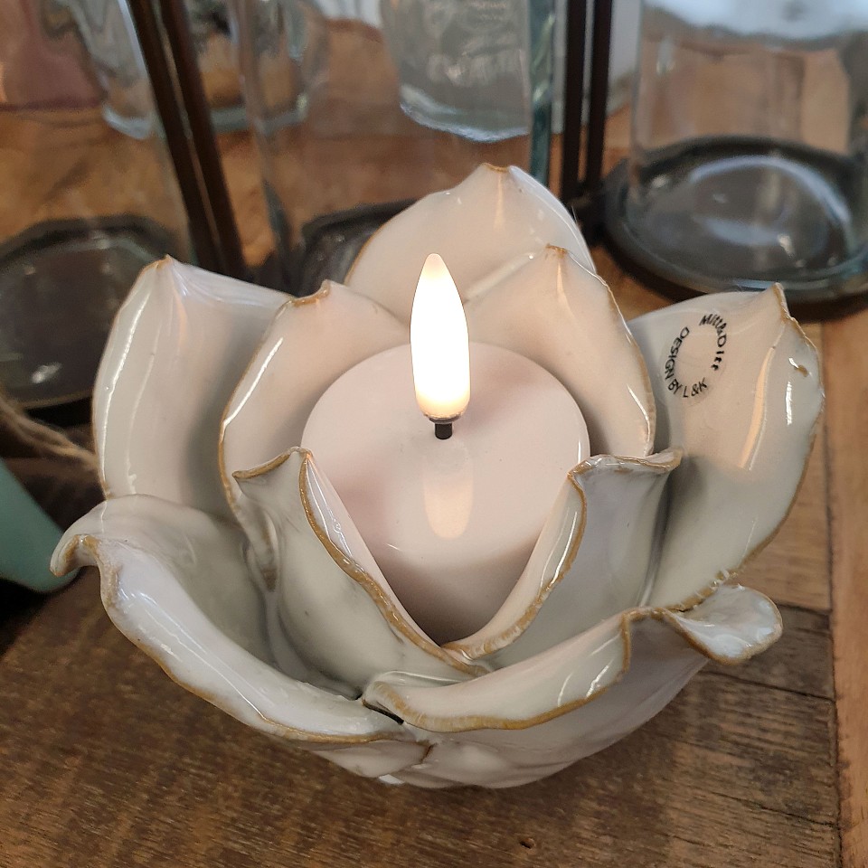 Ljuslykta Ros Garden, Cremevit. Vacker handgjord ljuslykta i keramik med formen av en ros. Ljuslyktan passar för värmeljus.