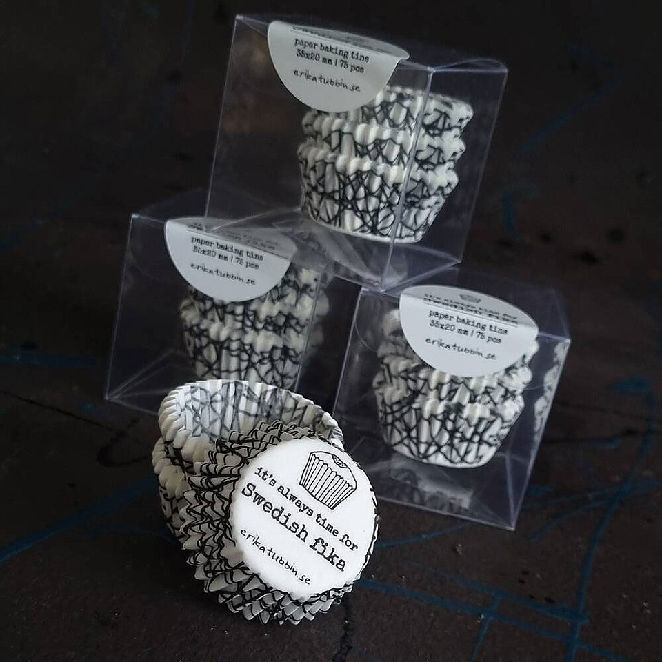 Muffinsformar Mini Swedish fika Muffins, 75 pack. Små bakformar i vitt med svart motiv runt sidan och texten "it's always time for Swedish fika" på undersidan. Formarna passar bra till minimuffins eller kakor som hallongrottor och havreformar. Stabilt, fettfast papper.