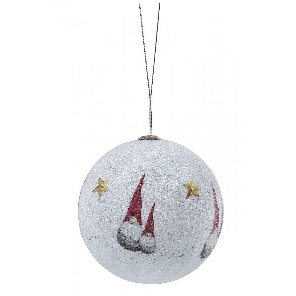 Julgranskula Dekortomte, Liten. Stämningsfull julkula i ljusgrått med frostad yta och motiv av jultomtar och små guldfärgade stjärnor.