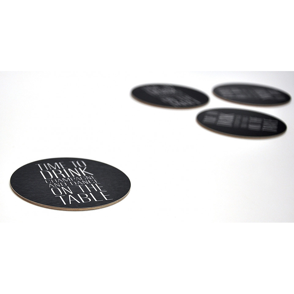Glasunderlägg Champagne 4-pack, Svart/Vit. Runda glasunderlägg i björkfanér med svart bakgrund och vit text "TIME TO DRINK CHAMPAGNE AND DANCE ON THE TABLE". Perfekt för champagneglaset, en kaffekopp, tekopp eller till mindre godsaker m.m. Tål maskindisk.