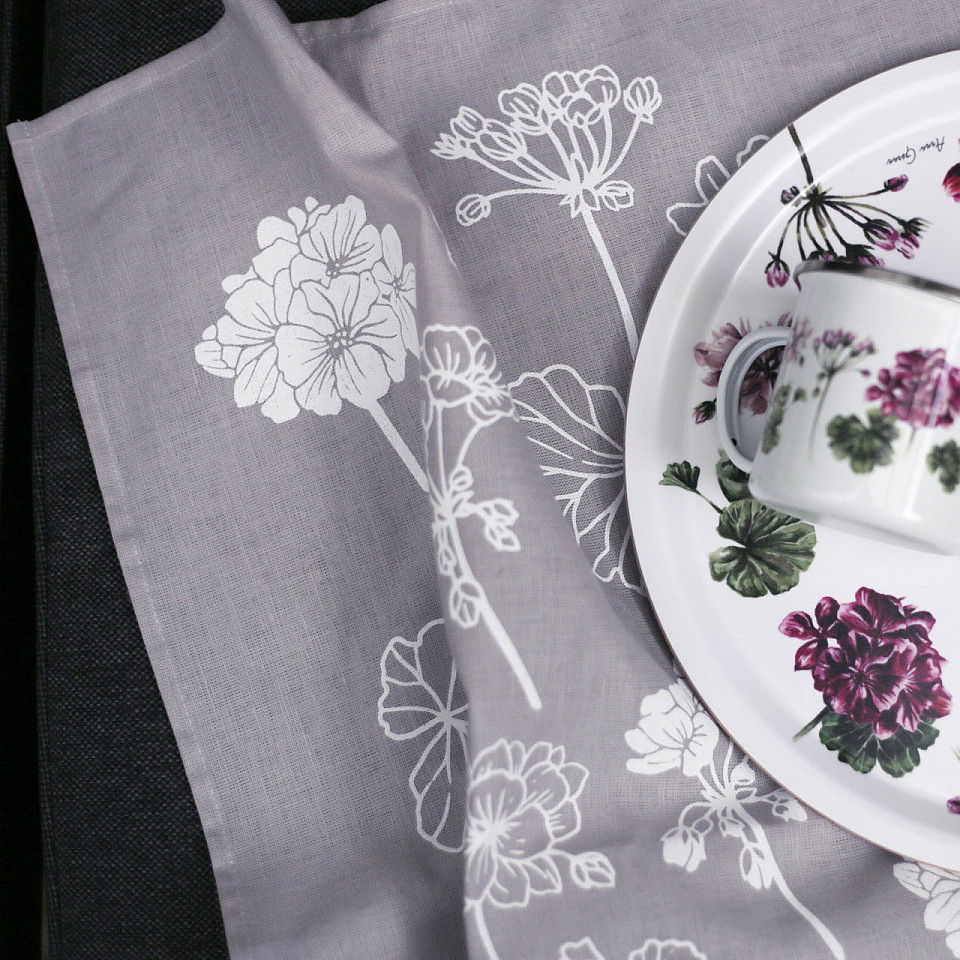 Kökshandduk "Pelargon" i ljusgrått med vitt tryck. Vackert blomstermotiv med pelargoner. Praktisk och dekorativ handduk till köket.