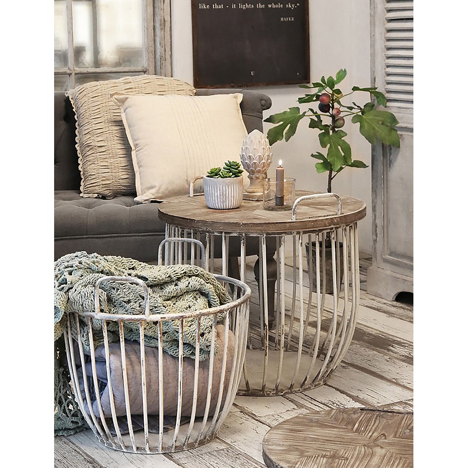 Soffbord med trälock. Snyggt bord i vintage stil som består av en korg i metall med två handtag och avtagbart lock i trä. Korgen är perfekt att förvara t.ex. plädar i.