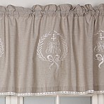 Gardinkappa "Emmy" med broderat monogram. Kappan är linfärgad och har bomullstyg med vitt spetsband och kanal för gardinstång. En vacker och romantisk kanalkappa i lantlig stil. Tvättas i 40º C.