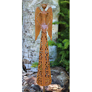 Ängel för marschall, Rost. Stor ängel i rostig metall/plåt med vackert mönster i kjolen, som håller i ett hjärta. Ängeln kan användas som marschallhållare eller till en ljusslinga. Plats för marschall i botten. En fin trädgårdsdekoration!